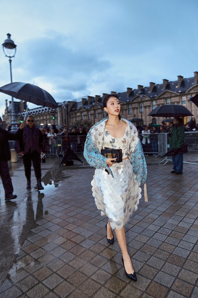 Đại diện Việt Nam duy nhất - fashionista Quỳnh Anh Shyn tham dự show diễn trong một look đầy màu sắc với hoạ tiết hoa. Cô nàng hoàn thiện tạo hình với giày cao gót mũi đen và clutch của nhà mốt. Show diễn này đã kết thúc hành trình tại Paris Fashion Week của "chiến thần"Việt Nam.