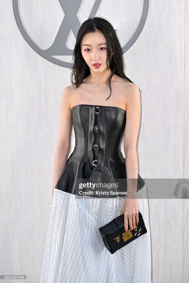 Châu Đông Vũ cá tính với chiếc áo corset và chân váy dài. Cô nàng để kiểu tóc đơn giản, layout makeup tông hồng, hoàn thiện look với clutch của thương hiệu.