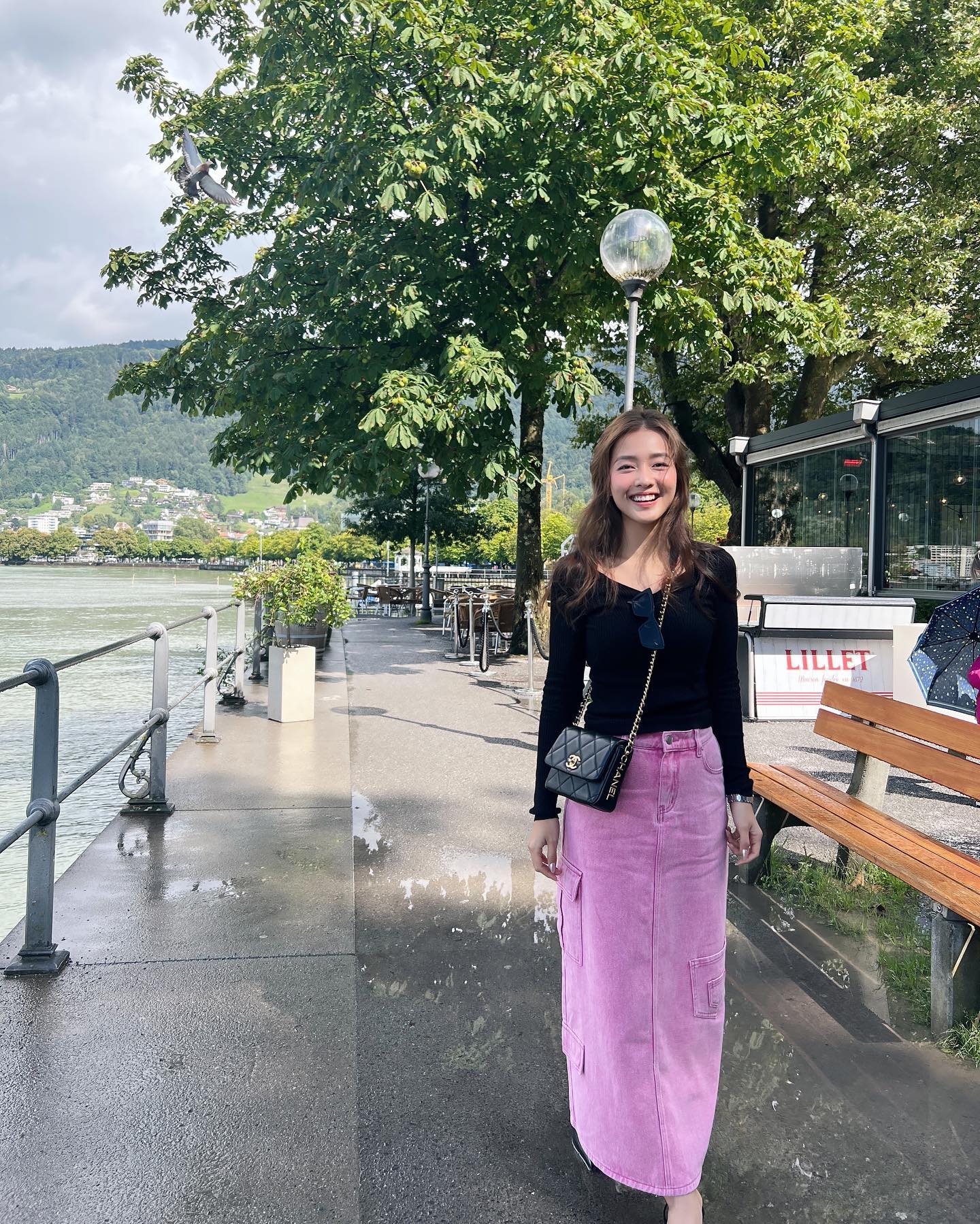 Cũng áp dụng công thức áo sơ mi và chân váy lụa nhưng phong cách của Salim lại mang đến ấn tượng khác so với Hồ Ngọc Hà. Nhờ đôi sandal và chiếc túi cói, outfit trên trông thoải mái, bay bổng, phù hợp để áp dụng trong những chuyến du lịch.