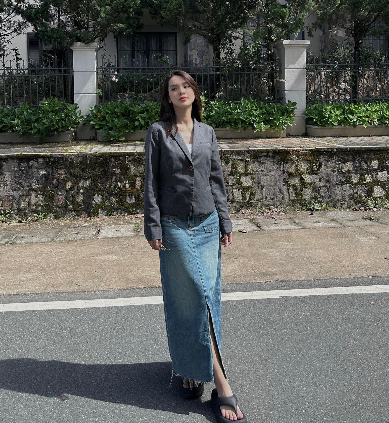 Áo blazer và chân váy denim đã tạo nên bộ trang phục không chỉ trẻ trung mà còn ghi điểm thanh lịch. Chi tiết xẻ tà của chân váy denim mang đến hiệu quả "hack" chân dài, từ đó vóc dáng cũng thêm phần cao ráo.