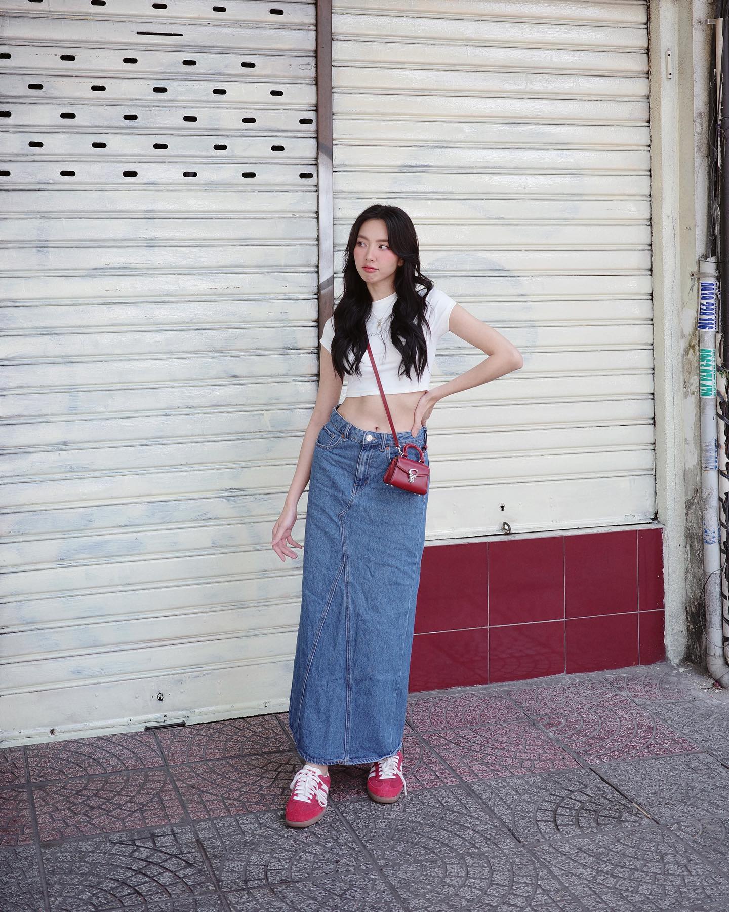 Hoa hậu Thùy Tiên gợi ý một set trang phục rất năng động, cá tính gồm áo crop top kết hợp với chân váy denim dáng suông. Cô nàng còn tăng sự nổi bật cho outfit bằng cách đeo túi xách và đi giày thể thao cùng tông màu đỏ.