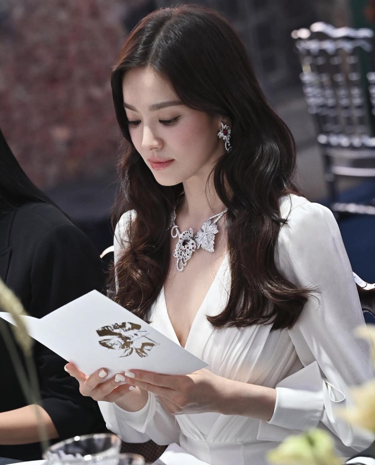 Với kiểu tóc xoăn buông lơi của Song Hye Kyo, không cần tạo kiểu quá nhiều, đôi khi chỉ đơn giản là buộc nửa đầu, buộc hay búi gọn để thừa vài lọn tóc rủ nhẹ là đã thanh lịch, kiêu sa vô cùng.