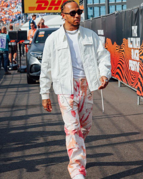 Hamilton đã diện một chiếc áo khoác bomber in họa tiết sặc sỡ cho giải Grand Prix Úc với một chiếc quần dài màu xanh nước biển bóng loáng. Ví dụ này chỉ là một trong nhiều cách mà anh ấy đã kết hợp nhiều phong cách khác nhau để tạo nên một kiểu dáng nổi bật.