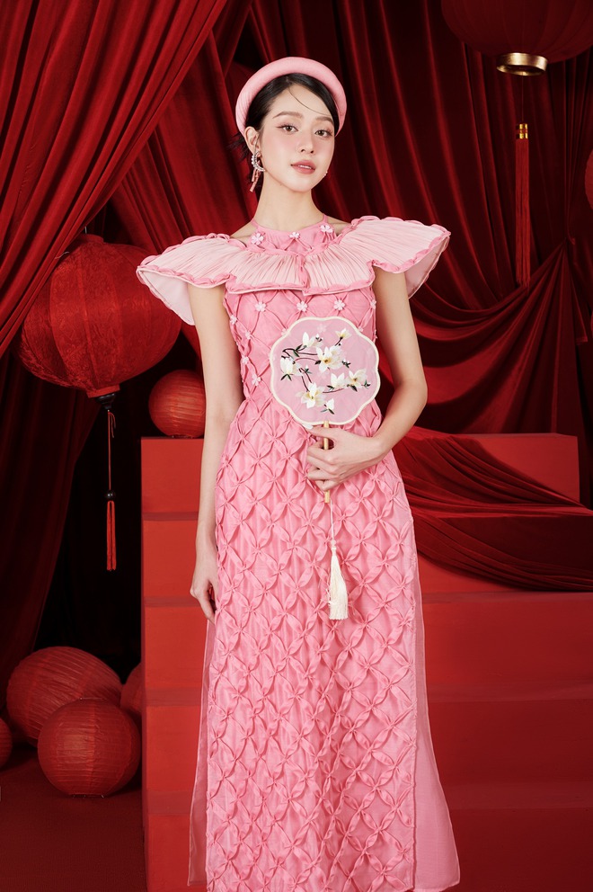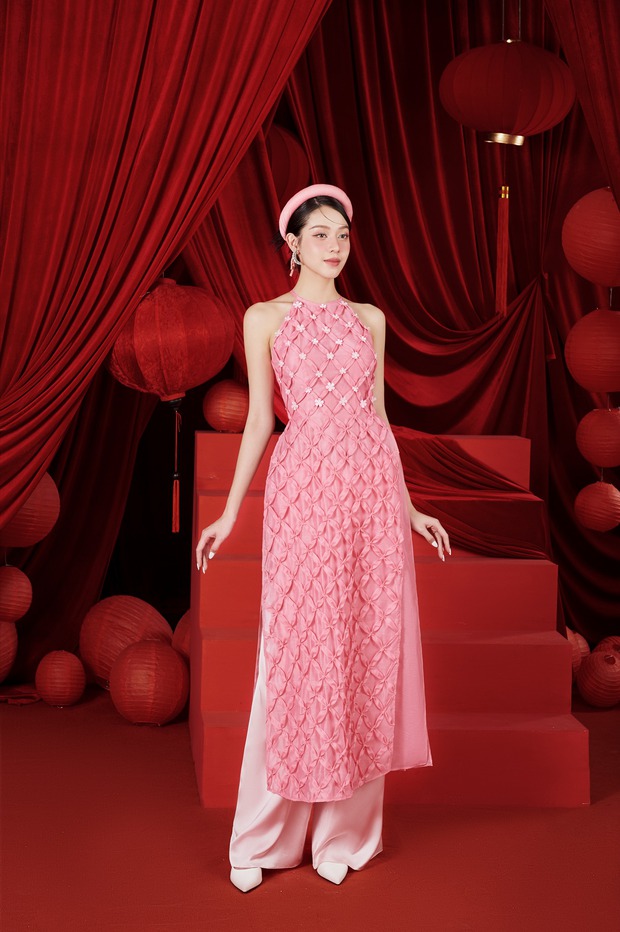 Bộ áo dài với gam màu hồng phấn của hoa đào, điểm xuyết chi tiết hoa nhỏ xinh ngọt ngào, lấp ló đôi xương quay xanh gợi cảm. Chất liệu dày dặn đứng dáng để ngay cả các nàng không mấy tự tin với vòng 2 của mình, diện lên vẫn thanh thoát, mảnh mai vô cùng.
