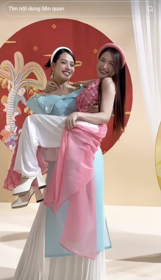 "Trùm cuối" mới là nhân vật khiến dân tình không thể nhịn cười. Hòa Minzy sở hữu chiều cao loanh quanh mét rưỡi vẫn sẵn sàng đụng hàng cả dàn Bông hậu Vbiz. Trong khoảnh khắc tạo dáng cùng Hoa hậu Thanh Thủy, Hòa Minzy khiến công chúng không thể rời mắt khỏi nét đáng yêu nhí nhảnh của bà mẹ 1 con khi khoe sắc trong tà áo dài cổ yếm này.
