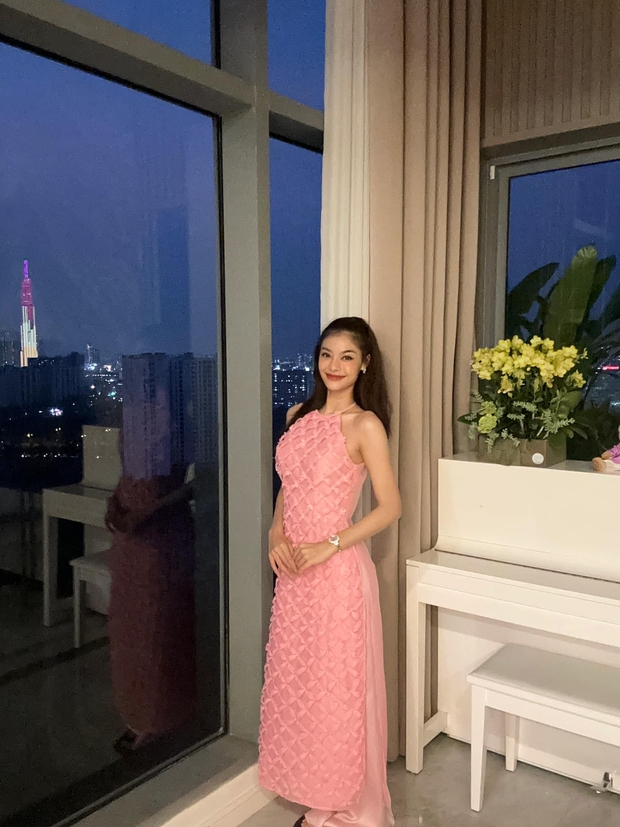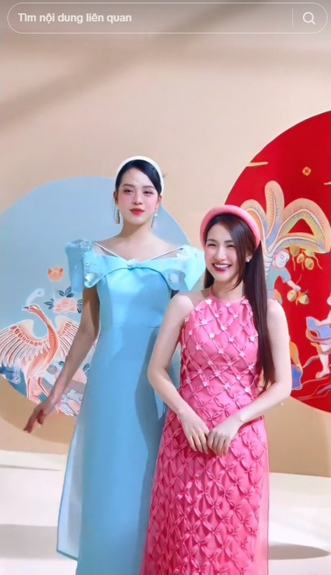 Đụng hàng với Thủy Tiên là Hoa hậu Thanh Thủy. Nếu Thùy Tiên chọn phong cách nhẹ nhàng đầy e ấp thì Thanh Thủy lại ngọt ngào mong manh quá đỗi với mái tóc búi cao, layout make up ửng hồng khi diện mẫu áo dài đậm sắc xuân ngời này.
