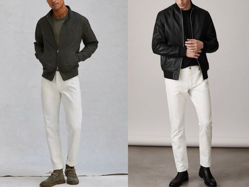 Với màu trắng tinh khôi của quần jean, bạn có thể chọn áo khoác kaki màu tối để tạo sự cân bằng cho trang phục của mình. Đồng thời, việc mix quần jean trắng nam với áo khoác kaki cũng mang lại sự thoải mái khi di chuyển và tự tin hơn khi gặp gỡ người ấy.