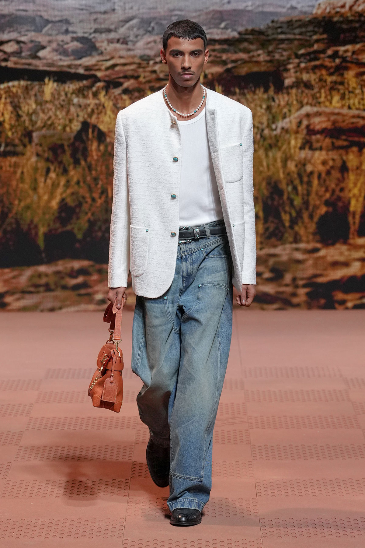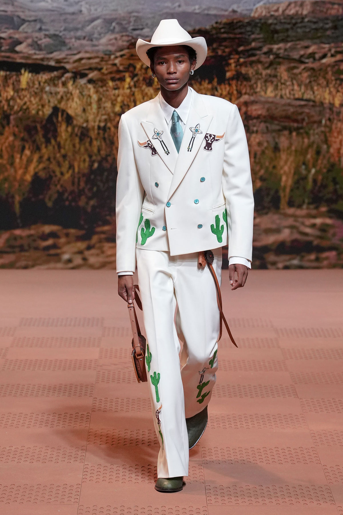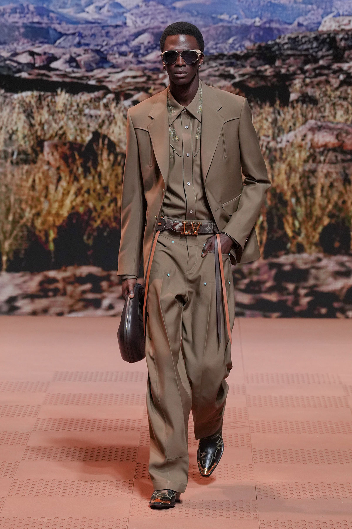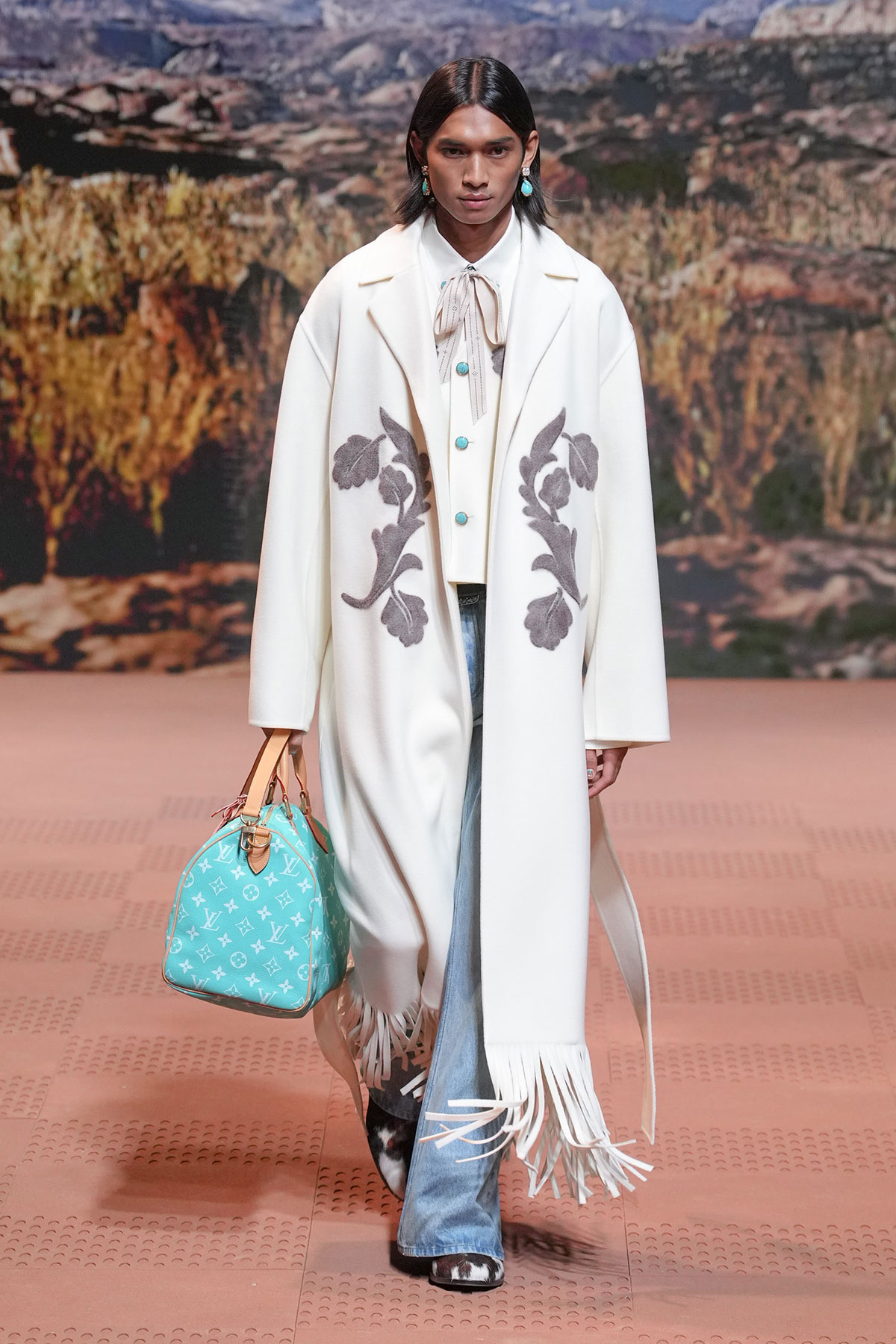 Thông qua những bộ vest được cắt may sắc sảo, sự kết hợp chu đáo giữa da lộn mềm và da bóng, bộ sưu tập Louis Vuitton Men Thu Đông 2024 khám phá miền Tây nước Mỹ chủ yếu thông qua kết cấu, thậm chí đến từng chi tiết nhỏ nhất. Nhiều kiểu dáng được trình diễn trên sàn diễn Louis Vuitton kết hợp nhiều lớp quần áo, bao gồm áo khoác tua rua thêu cài cúc màu trắng sắc nét, áo khoác denim mix cùng cà vạt bolo cổ điển.