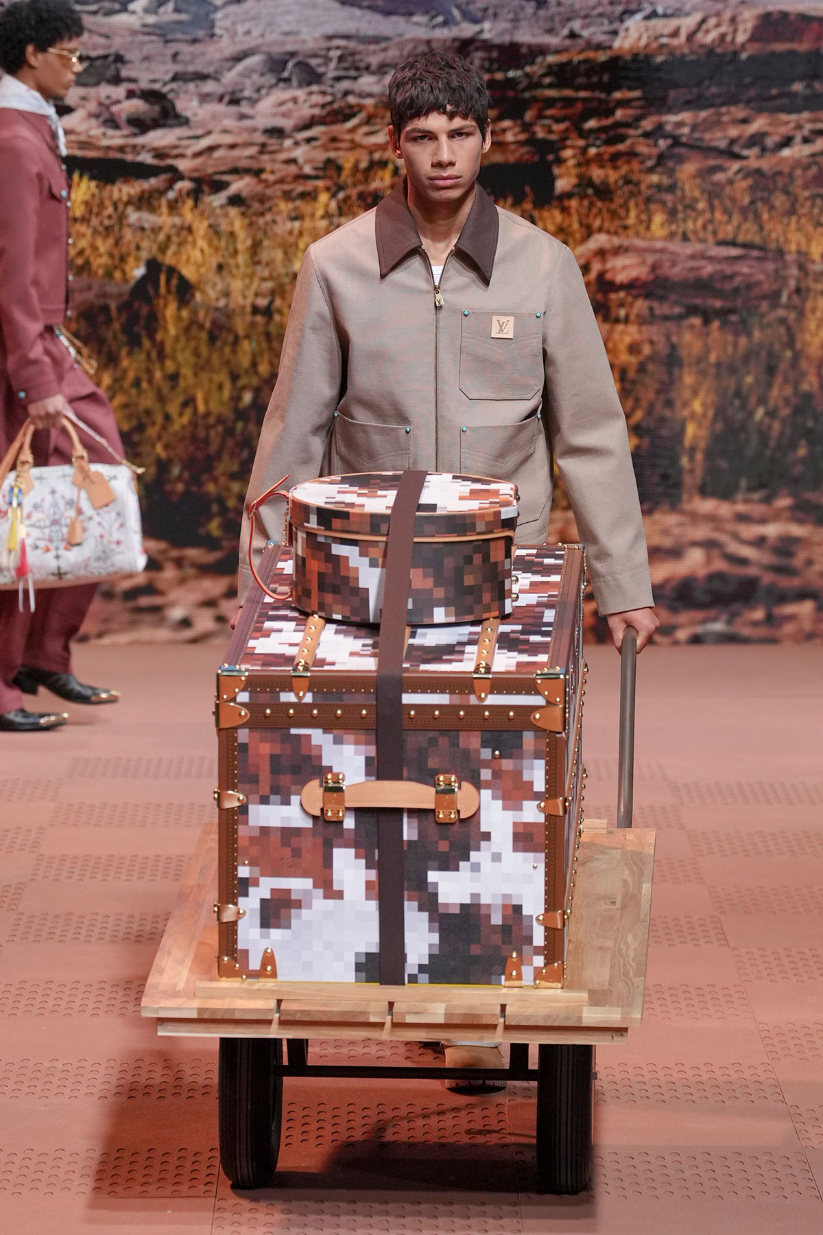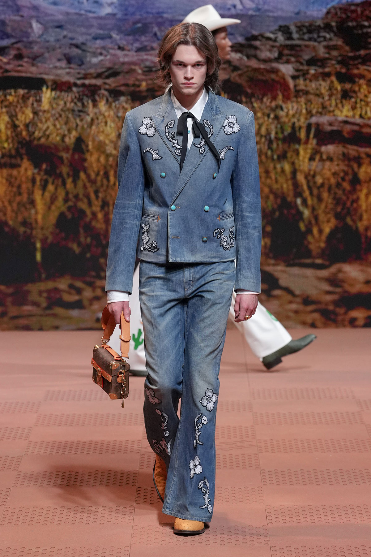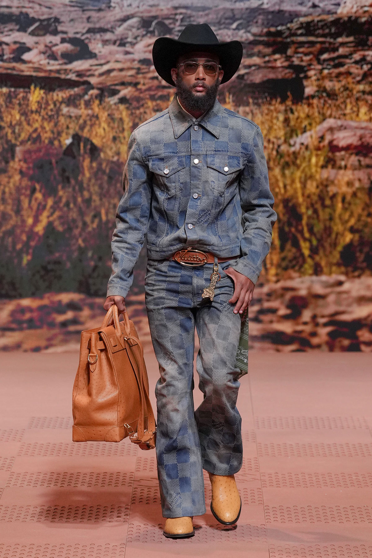 Áo khoác denim và bốt cao bồi là trọng tâm của bộ sưu tập. Đây đó thấp thoáng hình bóng của đồ bảo hộ lao động cổ điển và áo sơ mi cao bồi được nâng cấp, biến đổi thông qua kỹ thuật cắt may đặc biệt của Louis Vuitton.