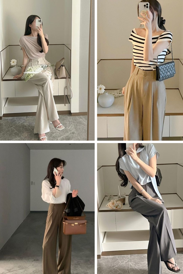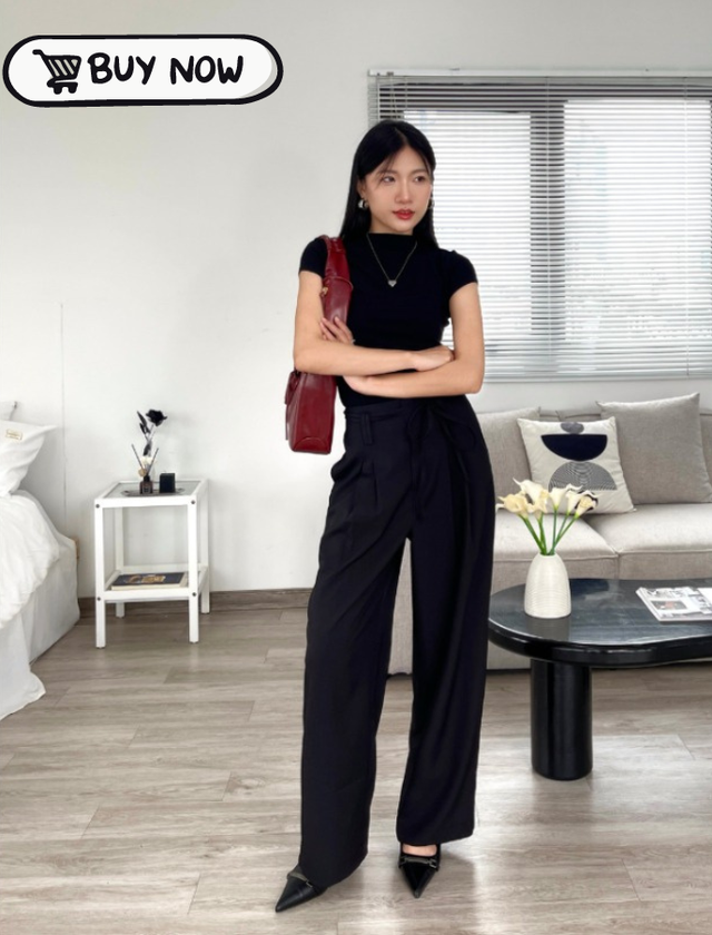 Một lưu ý nhỏ khi diện quần âu ống rộng để có vẻ ngoài chỉn chu, lịch sự lại có thể "ăn gian" chiều cao tuyệt đối. Đó là các nàng nên áp dụng chiêu sơ vin thay vì bỏ áo ngoài quần. Về màu sắc, các gam màu basic và trung tính như: Đen, trắng, xám, nâu, be... hoặc màu pastel được ưa chuộng tuyệt đối. Lý do bởi vì chúng vừa trang nhã, dễ phối đồ lại tôn nước da.