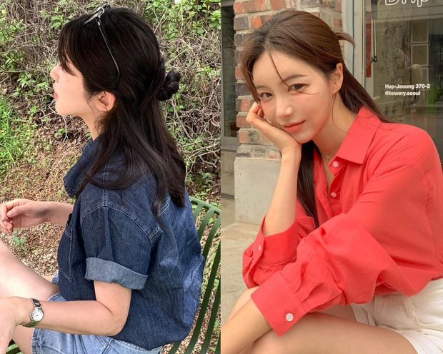 Tóc buộc nửa rất điệu đà và nữ tính. Áp dụng kiểu tóc này khi mặc áo sơ mi, vẻ ngoài của các nàng sẽ trở nên nổi bật. Tóc buộc nửa đặc biệt thích hợp với các set áo sơ mi chỉn chu, đứng dáng, chẳng hạn như sơ mi + chân váy suông hay sơ mi + quần âu công sở. Kiểu tóc này sẽ tăng thêm vẻ sang trọng và yêu kiều cho diện mạo của bạn.