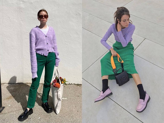 Áo tím + váy xanh