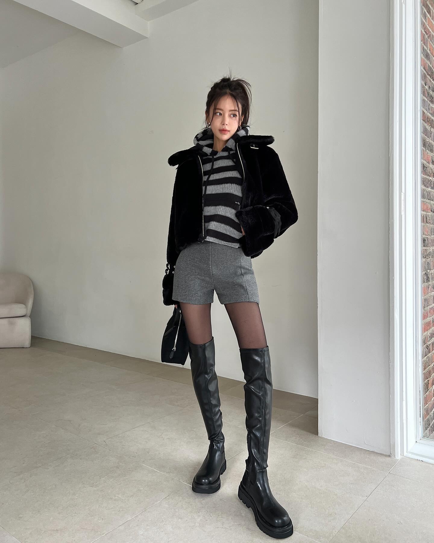 Quần short và boots cao cổ sẽ mang đến ấn tượng khác hẳn cho phong cách, đó là sự cá tính và năng động. Quần short và boots cao cổ đều là những món thời trang nổi bật, hút mắt. Do đó, chị em chỉ cần kết hợp với áo len/áo thun và áo khoác đơn giản là có được tổng thể trang phục ấn tượng. Công thức quần short và boots cao cổ cho hiệu quả tôn dáng tối ưu, nàng sở hữu chiều cao khiêm tốn rất nên tham khảo. Giống như khi diện váy ngắn, quần short cũng nên được kết hợp với quần tất đen để tăng hiệu quả giữ ấm và cộng thêm điểm sang trọng cho phong cách.