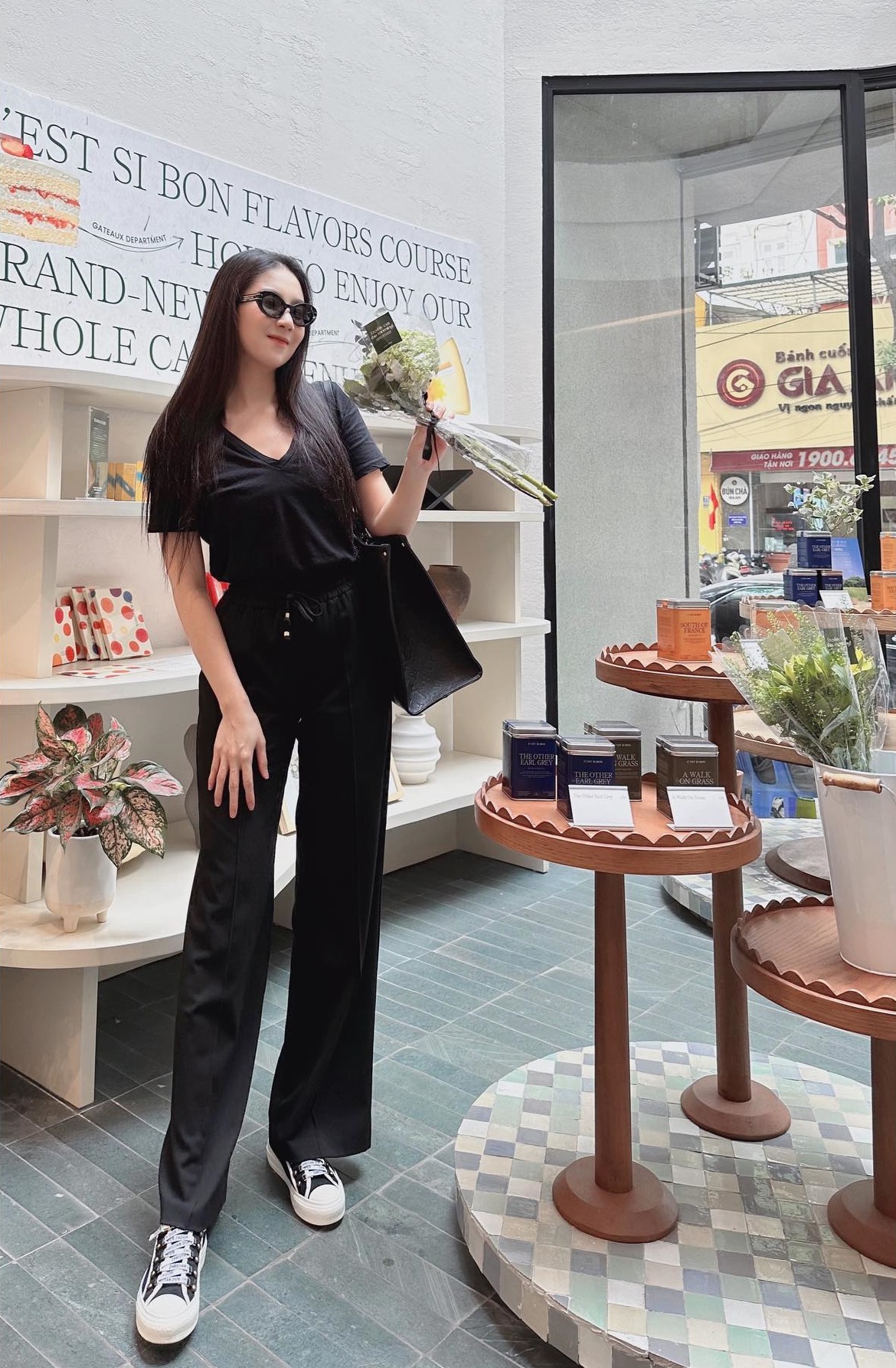 Mai Ngọc gợi ý bộ trang phục thoải mái, nhẹ mát gồm áo thun kết hợp với quần cạp chun, ống suông. Dù mang tông màu đen làm chủ đạo, bộ cánh không cộng tuổi cho người mặc. Khi hoàn thiện outfit bằng một đôi giày thể thao, phong cách của Mai Ngọc còn thêm phần trẻ trung, năng động.