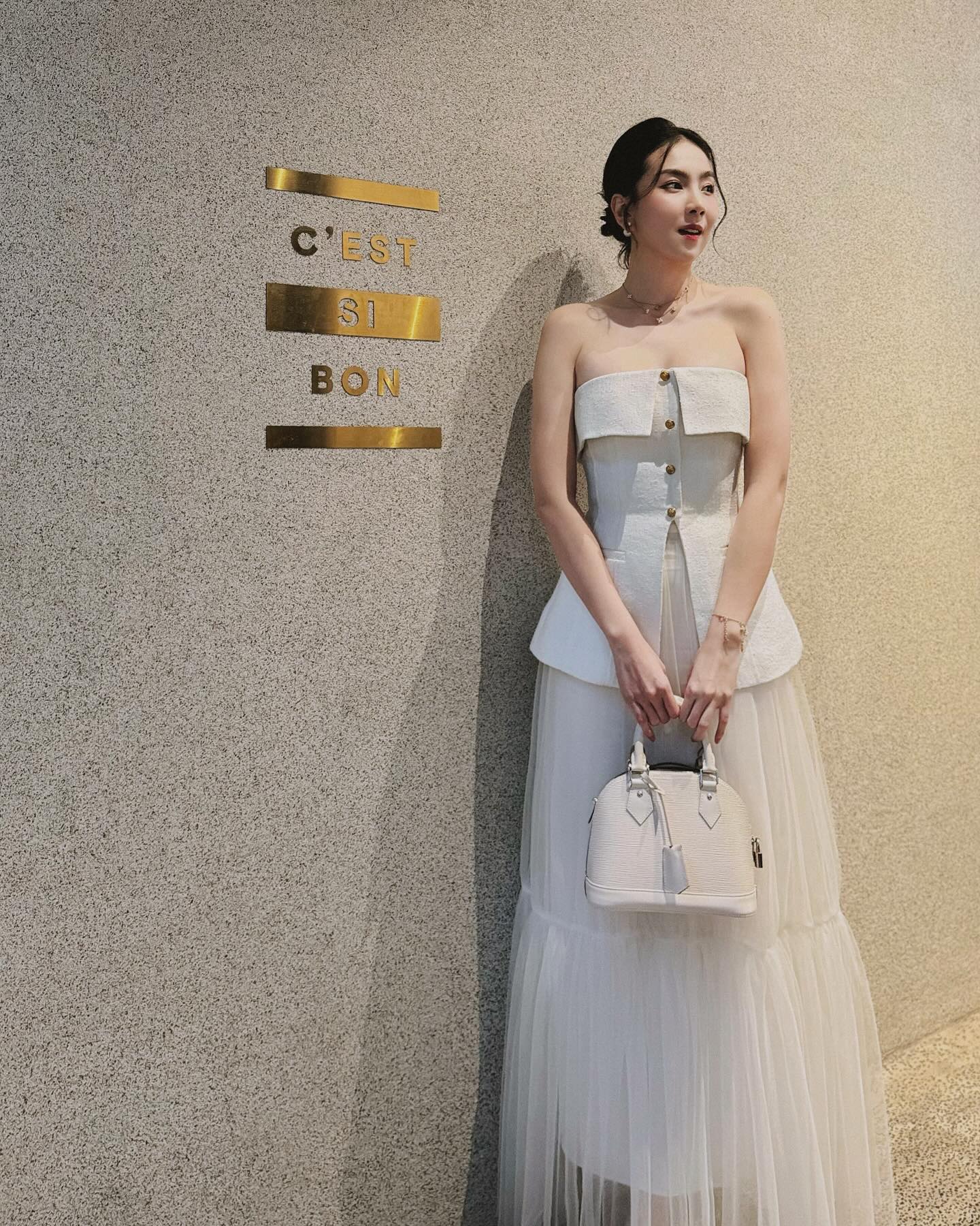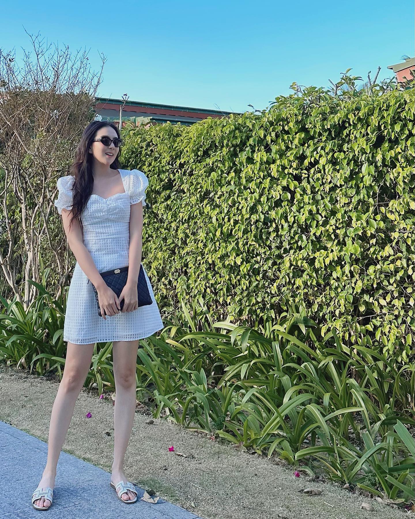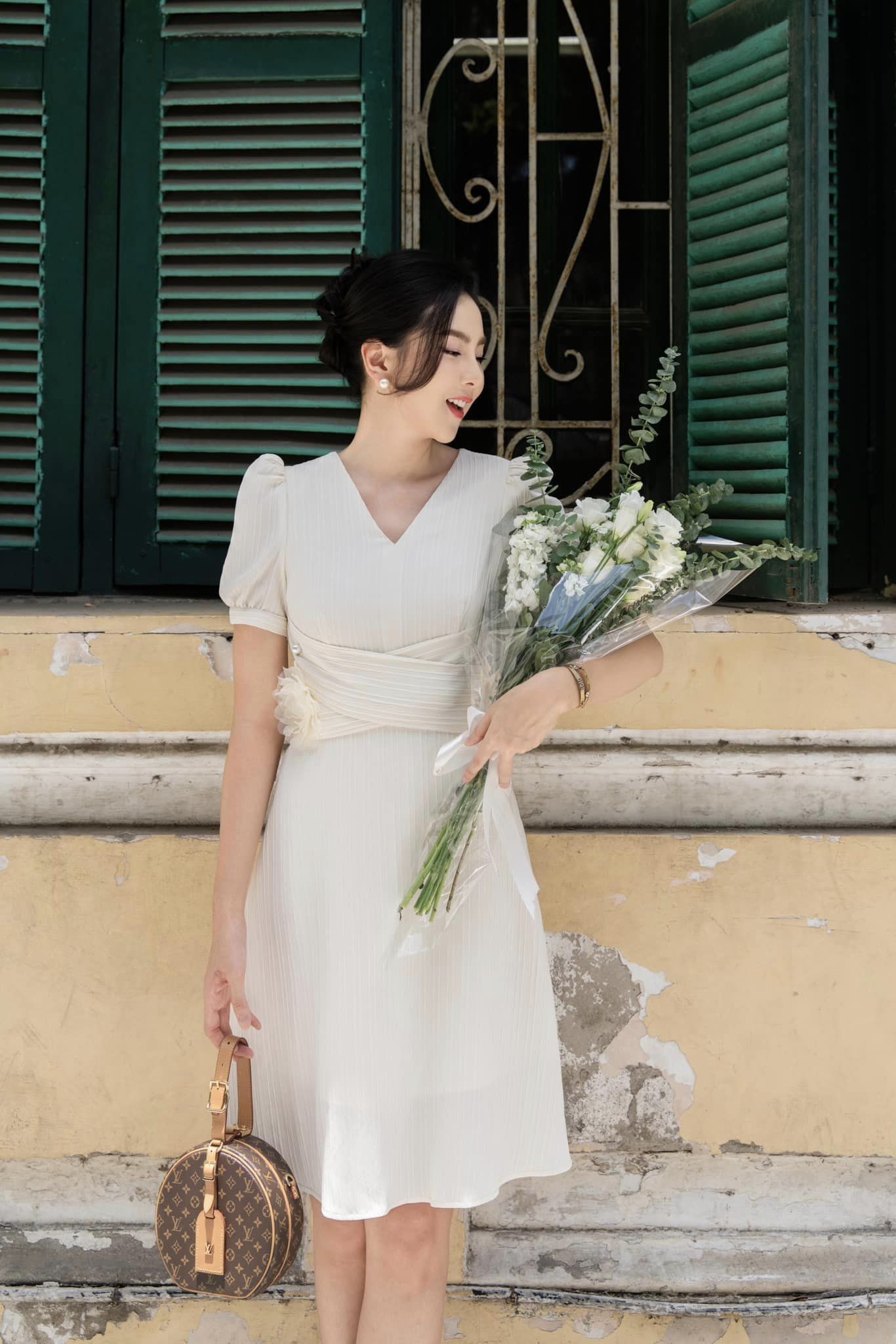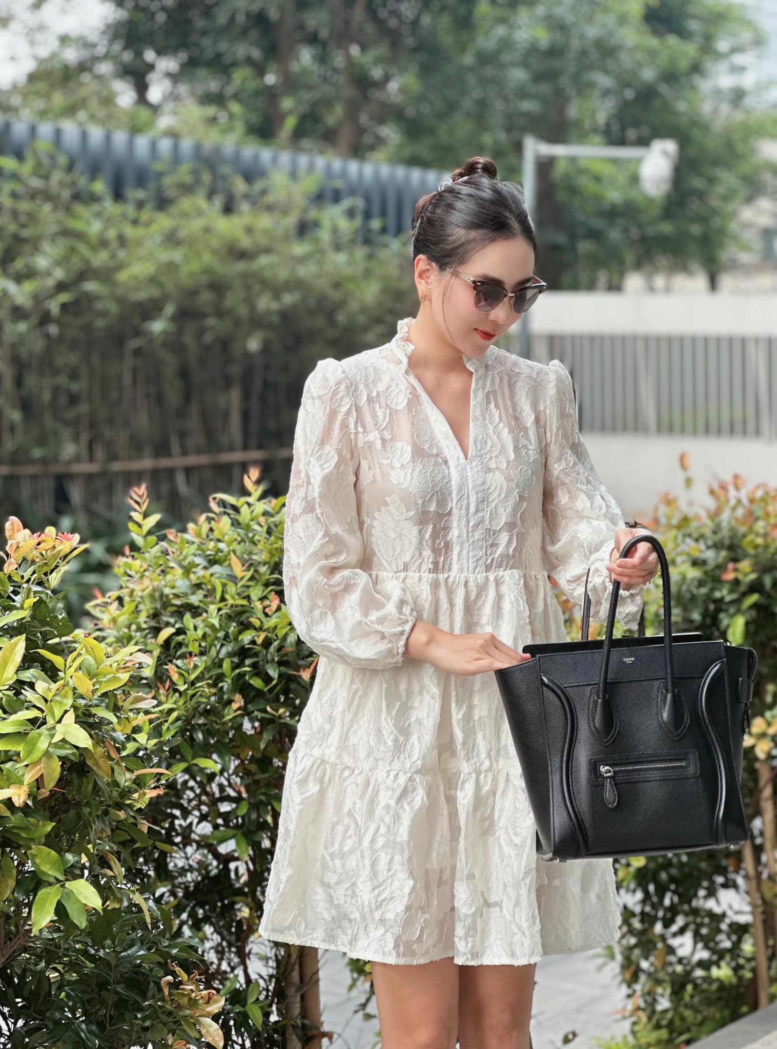 Để không phải suy nghĩ nhiều khi phối đồ, nhưng vẫn có vẻ ngoài nổi bật, cuốn hút, chị em hãy tham khảo set áo trắng và chân váy mini đồng bộ của Mai Ngọc. Kiểu tóc buộc nửa đã "ăn nhập" hoàn hảo với bộ cánh ngọt ngào. Set đồ trên còn giúp chính chủ có những bức hình "sống ảo" siêu xinh.