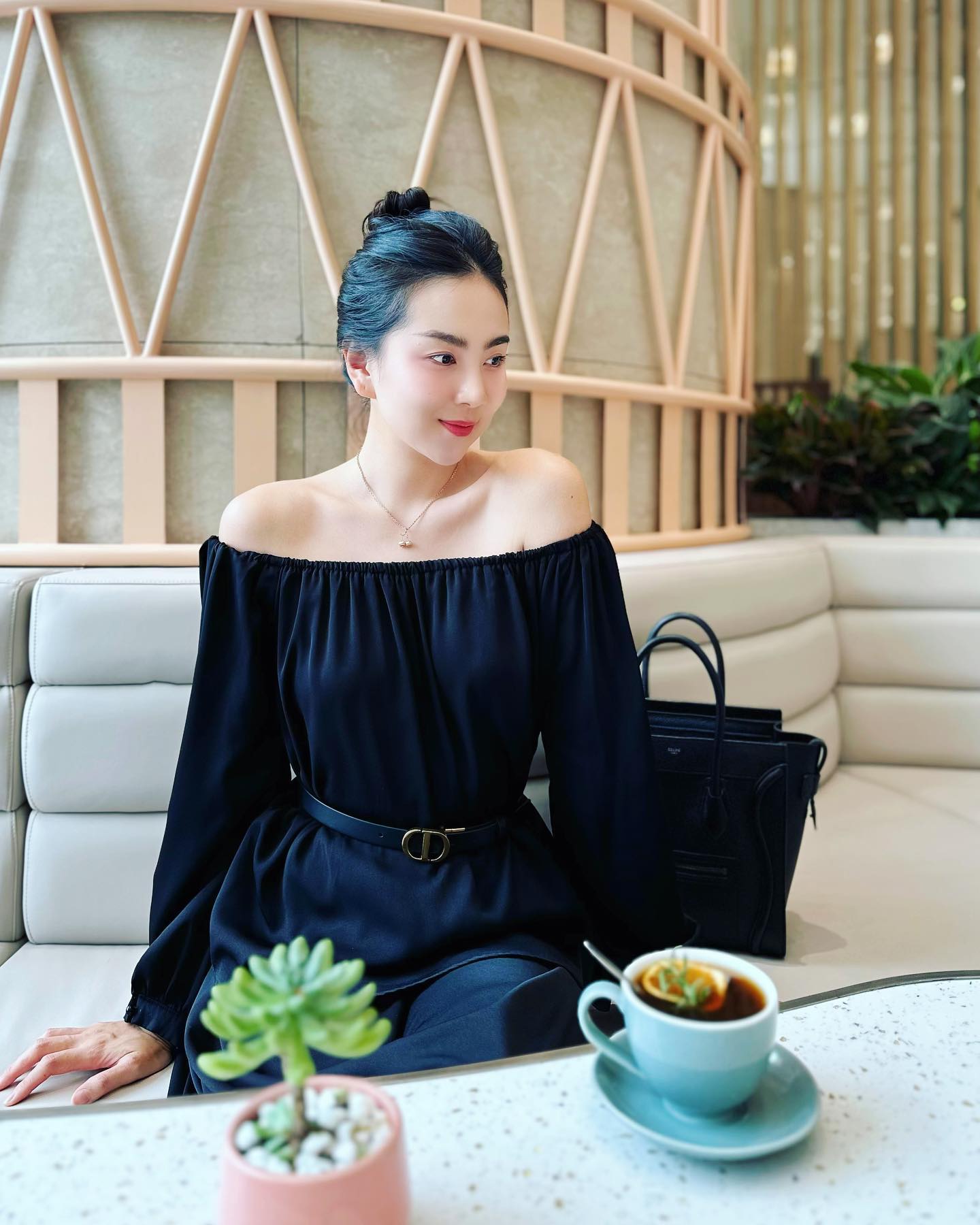 Chị em đừng bỏ qua những chiếc áo trễ vai trong mùa hè. Mai Ngọc đã kết hợp mẫu áo trễ vai mang tông màu đen với quần dài xuyệt tông, từ đó có được outfit đầy nữ tính, quý phái. Chi tiết nhấn eo tạo sự chỉn chu cho tổng thể trang phục, đồng thời tôn dáng hiệu quả.