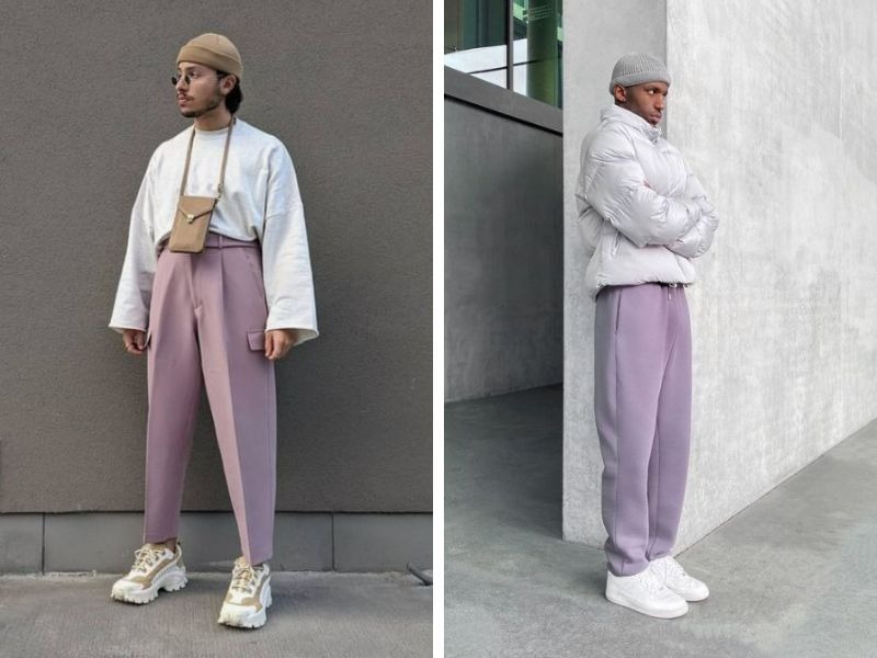 Phối màu tím và màu xám trong trang phục nam sẽ giúp các bạn nam trông trẻ trung và tinh tế. Bạn có thể kết hợp hai màu sắc này với áo sơ mi tím và quần xám lịch sự, phù hợp với nhiều dịp từ công việc đến sự kiện trang trọng. Tương tự, bạn cũng có thể chọn áo thun, quần jogger vải, áo khoác bomber hay áo hoodie để mặc.