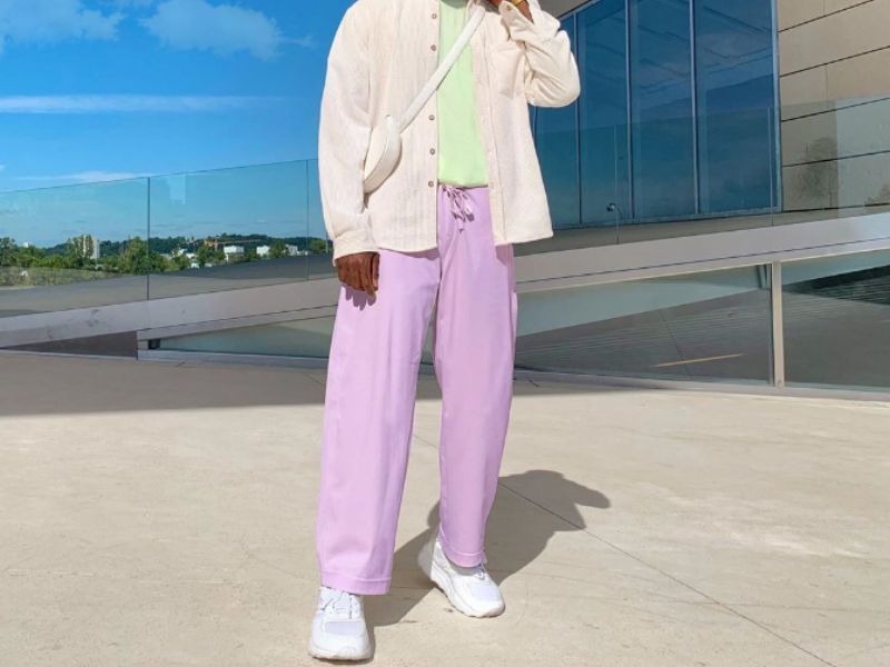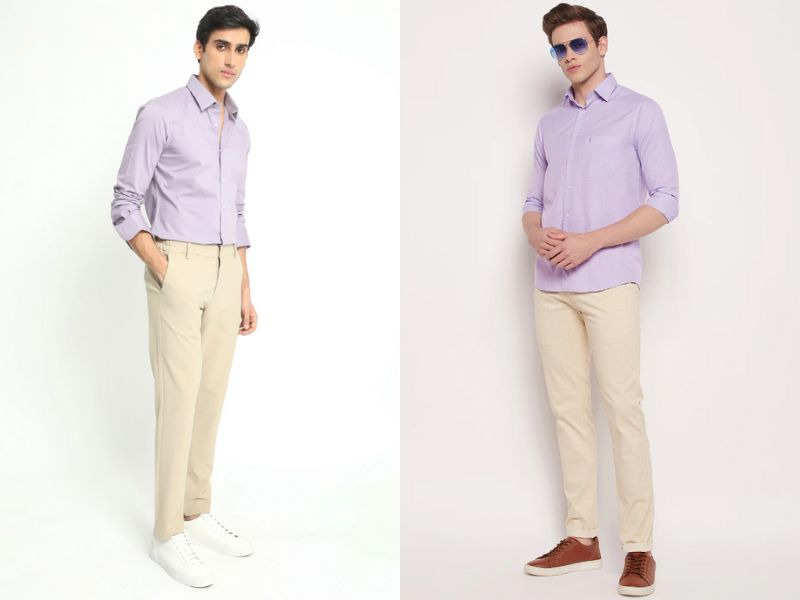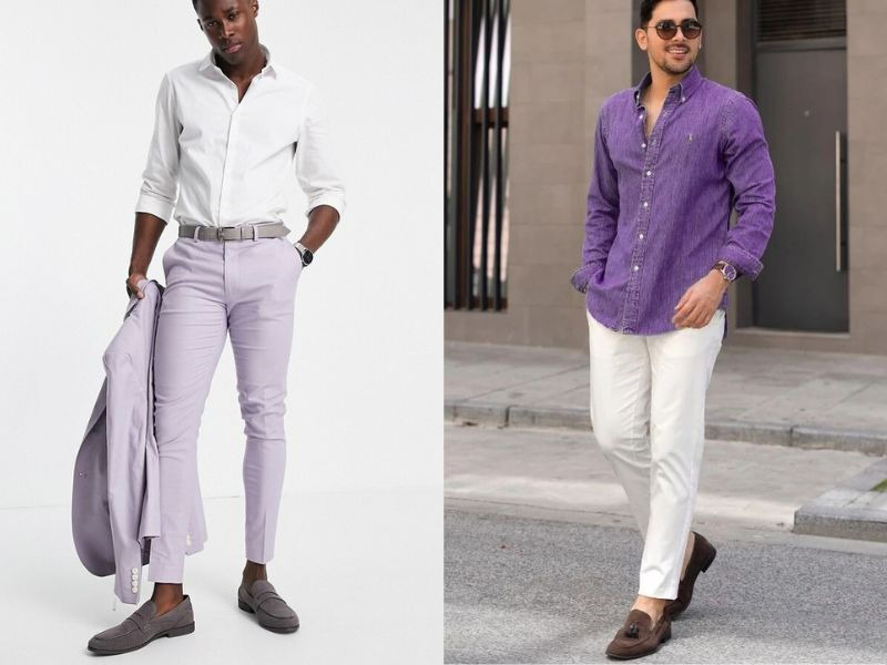 Kết hợp màu tím với màu hồng sẽ tạo ra một phong cách vô cùng thú vị và phá cách cho các anh chàng sành điệu. Bạn có thể chọn áo sơ mi nam màu tím phối cùng quần chinos màu hồng nhạt để trang phục trông cân đối hơn đồng thời cũng rất nổi bật, mang đến phong cách nhẹ nhàng.