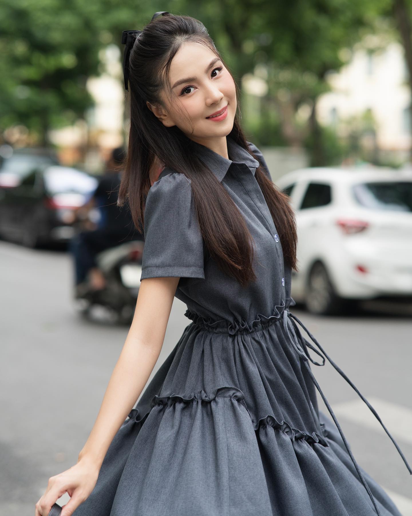 "Chân ái" của MC Mai Ngọc là các thiết kế váy ngắn điệu đà, có chi tiết tay bồng hoặc nhấn nhá bèo nhún. Những mẫu váy ngắn này giúp vẻ ngoài thêm nổi bật và sang chảnh nhưng vẫn ghi điểm trẻ trung. Để phát huy tối ưu công dụng tôn dáng của váy ngắn, chị em nên đi những mẫu giày "nịnh chân" như giày cao gót mũi nhọn, sandal quai mảnh, giày màu be hoặc giày mule…