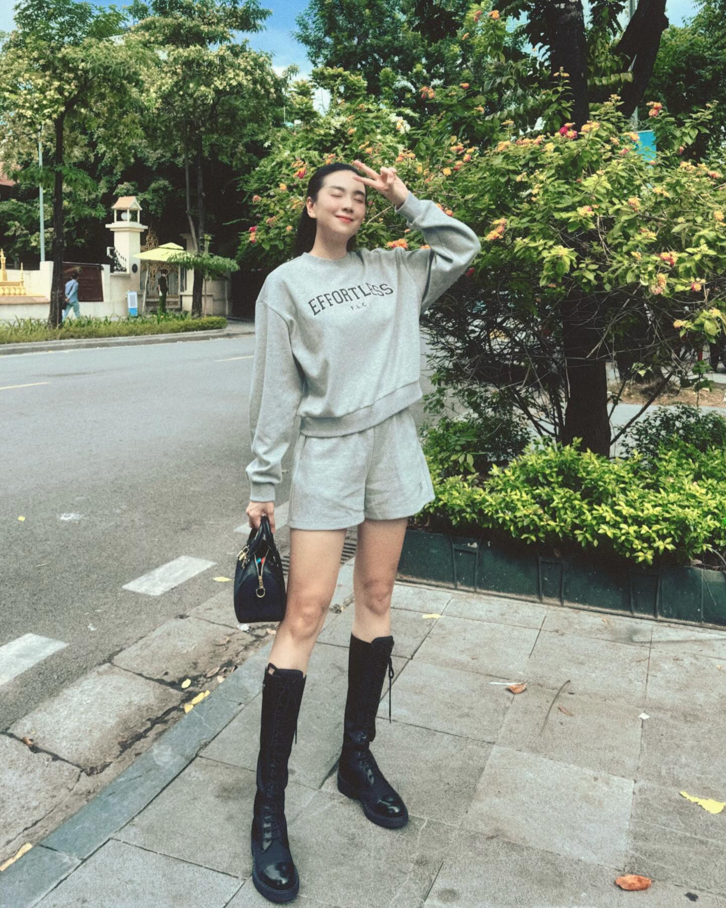 Tủ đồ mùa hè của chị em khó có thể thiếu đi những chiếc quần short. Món thời trang này mang đến cảm giác thoải mái khi diện, giúp người mặc có được vẻ ngoài trẻ trung, năng động. MC Mai Ngọc có những công thức diện quần short đầy cá tính, phóng khoáng như quần short + áo thun trắng, quần short + áo nỉ đồng bộ. Khi lên đồ với các set trang phục đậm chất thể thao, MC Mai Ngọc thường xõa tóc hoặc áp dụng kiểu tóc buộc nửa để vẻ ngoài vẫn có sự nữ tính, ngọt ngào.