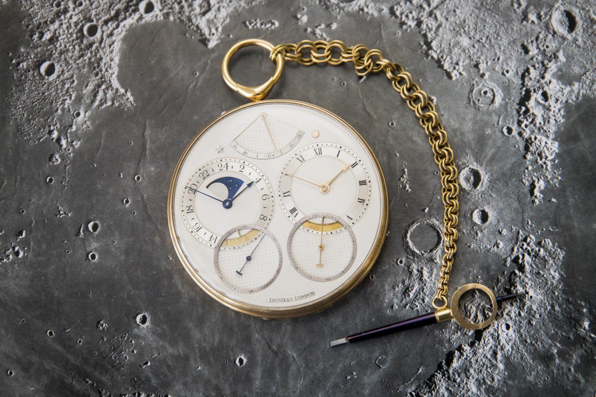 Chiếc đồng hồ hoạt động nhờ năng lượng mặt trời và tính được thời gian thiên văn, phương trình thời gian, lịch Mặt Trăng và một bánh xe đôi có chữ ký riêng của George Daniel, được đặt bên trong vỏ vàng 18 cara.