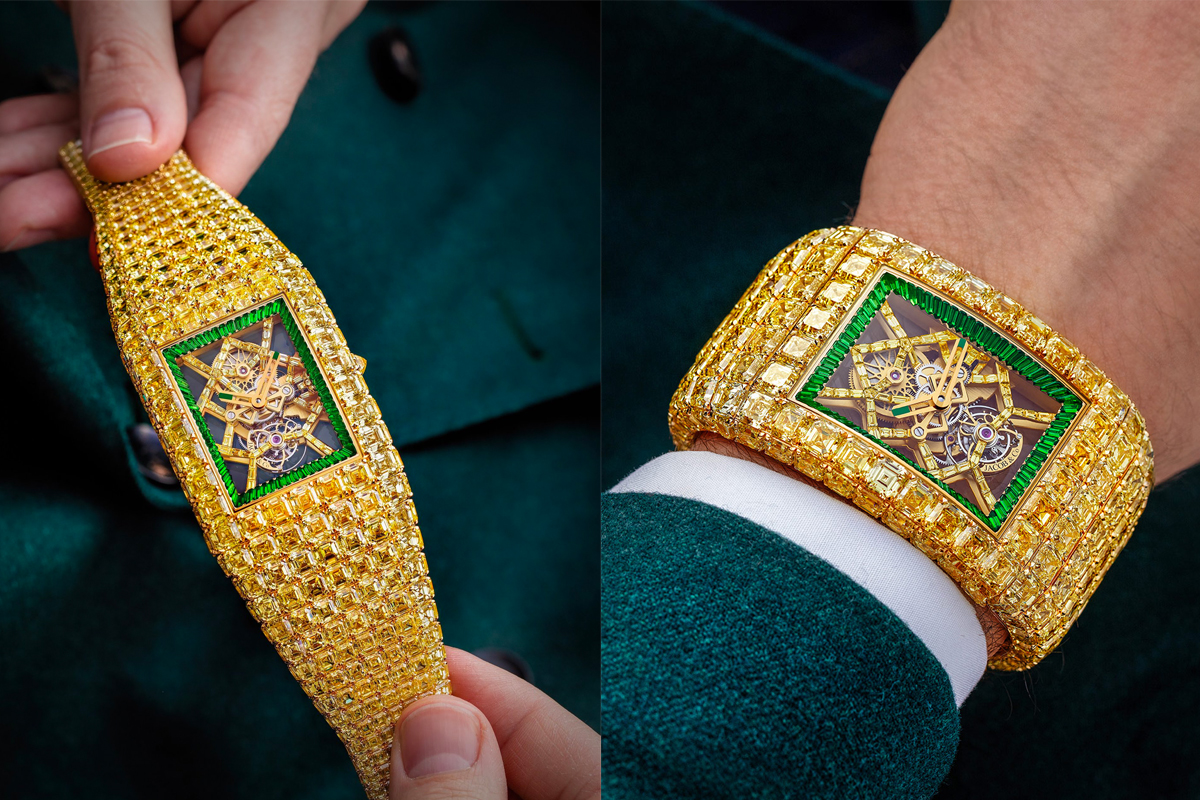 Ngắm nhìn Jacob & Co., Billionaire Timeless Treasure, bạn sẽ bị mê hoặc bởi sức quyến rũ của hơn 425 viên kim cương màu vàng cắt kiểu Asscher và 76 viên ngọc lục bảo/đá quý Tsavorite cắt hình diều tô điểm một cách duyên dáng cho cả vỏ và dây đeo.