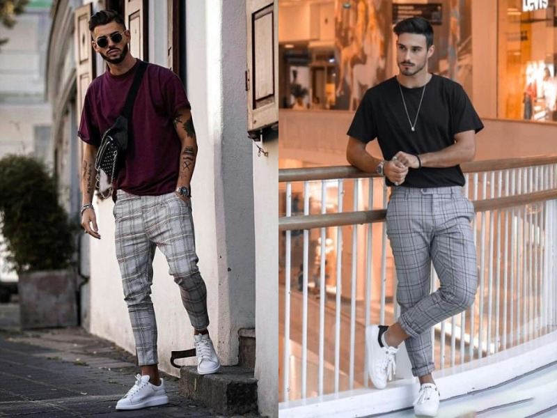 Quần kẻ sọc, áo thun phối đồ với túi đeo chéo ngực nam