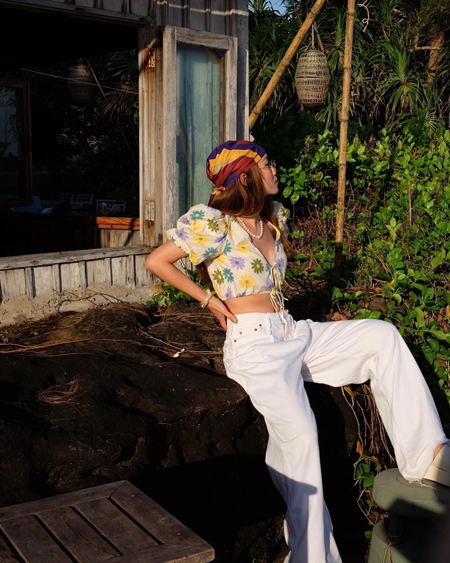 Công thức áo crop top và chân váy ngắn ghi điểm ở sự quyến rũ, năng động. Chị em có thể khoác ngoài một chiếc áo họa tiết hoa như lựa chọn của Yến Trang để tạo điểm nhấn nổi bật, phóng khoáng và góp phần che nắng hiệu quả.