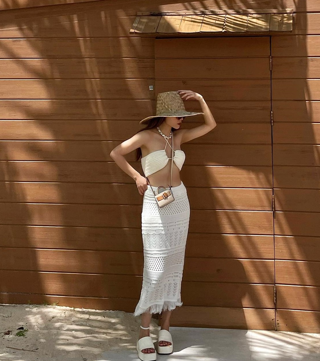 Nữ tính và đầy quyến rũ là ưu điểm của bộ cánh gồm áo bơi kết hợp với chân váy đan lưới. Các món phụ kiện như mũ cói hay vòng cổ ăn nhập hoàn hảo với bộ trang phục phóng khoáng. Chị em nên lựa chọn đôi dép lê độn đế như Yến Trang để tôn dáng tối ưu mà vẫn có cảm giác thoải mái, êm chân khi đi.