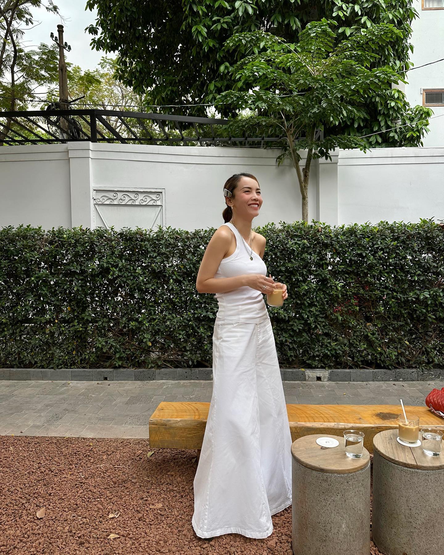 Không muốn phối đồ quá cầu kỳ khi đi du lịch, quý cô trên 40 tuổi hãy tham khảo công thức gồm áo tank top màu be kết hợp với quần trắng ống suông. Bộ đồ trên toát lên nét phóng khoáng, trẻ trung nhưng cũng rất trang nhã. Chị em nên sơ vin để không bị "dìm" dáng khi mặc quần ống rộng.