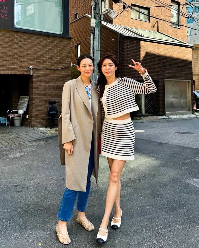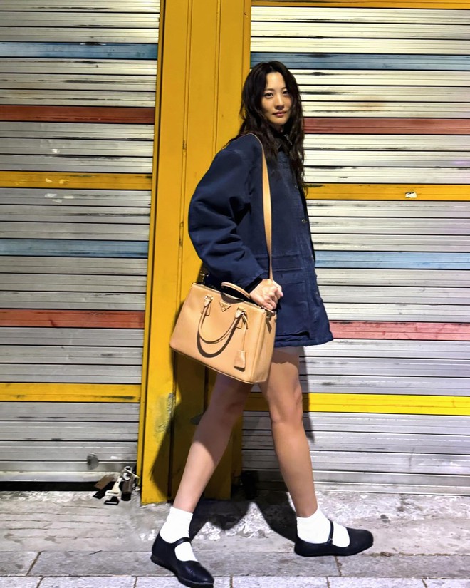 Công thức áo khoác màu xanh navy và quần ngắn giúp người diện có được vẻ ngoài trẻ trung, năng động. Claudia Kim đã chọn giày Mary Jane để outfit thêm ngọt ngào mà không làm giảm đi nét sang trọng. Chiếc túi màu be trang nhã có thể "ăn nhập" hoàn hảo với mọi kiểu trang phục.