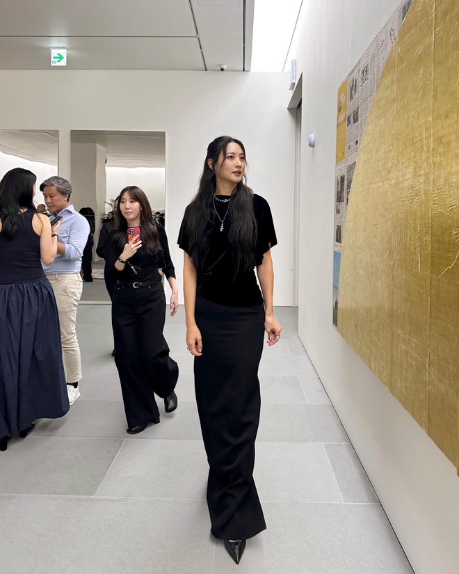Diện set trang phục mang tông màu đen làm chủ đạo nhưng Claudia Kim vẫn nổi bật. Lý do là bởi, bộ cánh bao gồm các item là "bảo chứng" cho vẻ ngoài sang trọng như áo nhung, chân váy suông dáng dài, giày cao gót mũi nhọn. Claudia Kim gợi ý kiểu tóc rất sang chảnh, yêu kiều để chị em áp dụng khi diện đồ đen, đó là tóc buộc nửa.