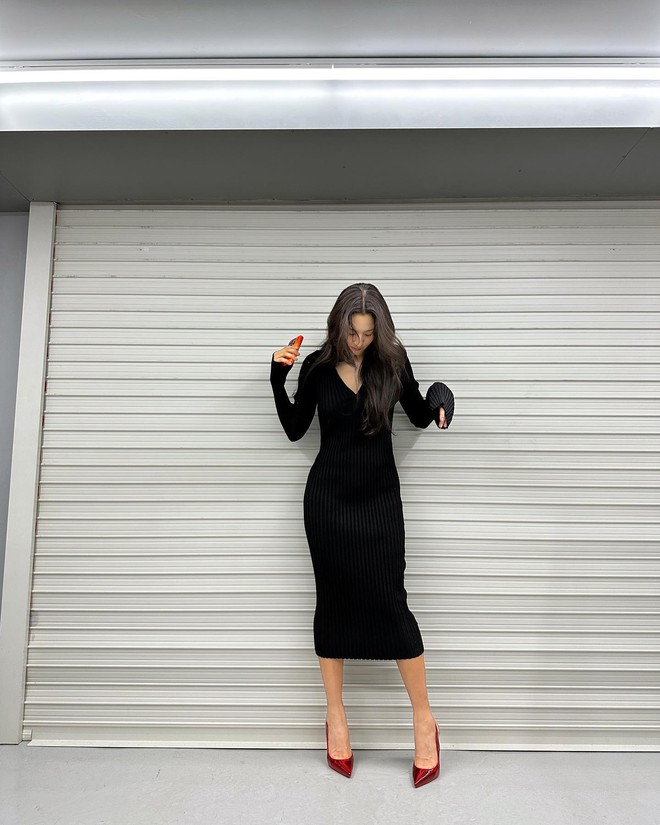 Thiết kế váy đen dệt kim khá đơn giản nhưng giúp tôn lên nét quyến rũ của người mặc, đồng thời mang đến sự sang trọng, tinh tế. Claudia Kim tạo điểm nhấn cho outfit bằng một đôi giày cao gót mũi nhọn, mang tông màu đỏ.