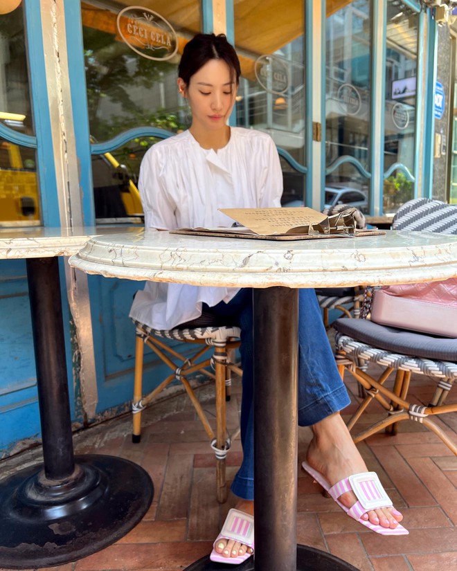 Công thức áo blouse trắng và quần jeans xanh không quá cầu kỳ nhưng giúp chị em có được vẻ ngoài trẻ trung, xen lẫn nét nữ tính. Để hoàn thiện outfit thoải mái, Claudia Kim không chọn giày dép đứng dáng. Thay vào đó, Claudia Kim đi dép lê màu sắc tươi tắn để bộ cánh thêm nổi bật, phóng khoáng.