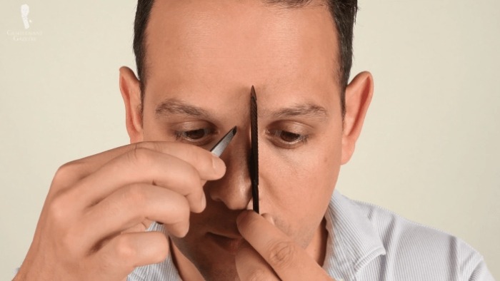 Bạn bắt đầu lấy một cây bút chì, lược hoặc cọ trang điểm dài, thẳng sau đó đặt thẳng đứng ở điểm giữa của cánh mũi. Đánh dấu điểm mà bút chì chạm vào lông mày, nó sẽ là điểm bắt đầu. Để xác định điểm cuối, hãy đặt cây bút chì đó ở đầu mũi và cố gắng khiến nó thẳng hướng về phía khóe mắt, điểm mà bút chì chạm vào sẽ là điểm cuối của lông mày.