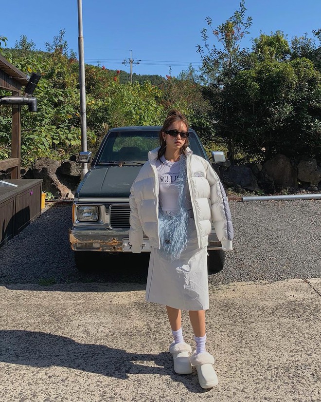 Với chân váy dài, @mulbada sắm về tủ đồ đa dạng các thể loại từ chất liệu jeans, vải dù tới form thụng, dáng chữ A... để thoả sức phối đồ. Đặc biệt, nếu để ý, các chị em có thể thấy khi diện chân váy dài, @mulbada thường phối cùng giày đế cao, giày thể thao nhằm tạo cảm giác thoát dáng và tươi trẻ hơn, tránh không đi bốt cao cổ tránh khiến bản thân lùn và to hơn. Các chị em với dáng người tương tự đừng bỏ qua tips "nhỏ mà có võ" này khi lên đồ nhé.