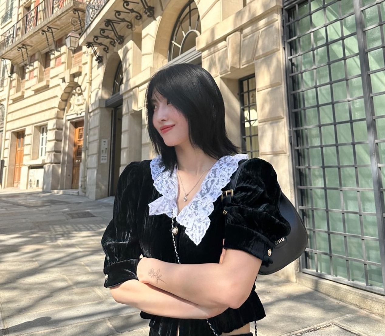 Dù mang tông màu đen và trắng làm chủ đạo nhưng công thức áo len màu đen + chân váy họa tiết hoa 3D vẫn rất nổi bật. Thiết kế chân váy ngắn còn giúp "hack" chiều cao hiệu quả và tăng thêm sự trẻ trung. Để không làm giảm đi nét tinh tế của outfit, các nàng nên chọn giày dép và túi xách mang tông màu trung tính.