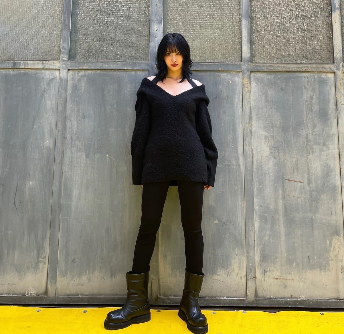 Cá tính, bụi bặm nhưng vẫn có sự tinh tế là công thức gồm áo len dáng dài kết hợp với quần legging. Đôi boots da có vai trò nâng cấp vẻ thời thượng cho bộ cánh. Vẻ ngoài của chị em sẽ thêm nổi bật và quyến rũ nếu tô son môi đỏ đậm.