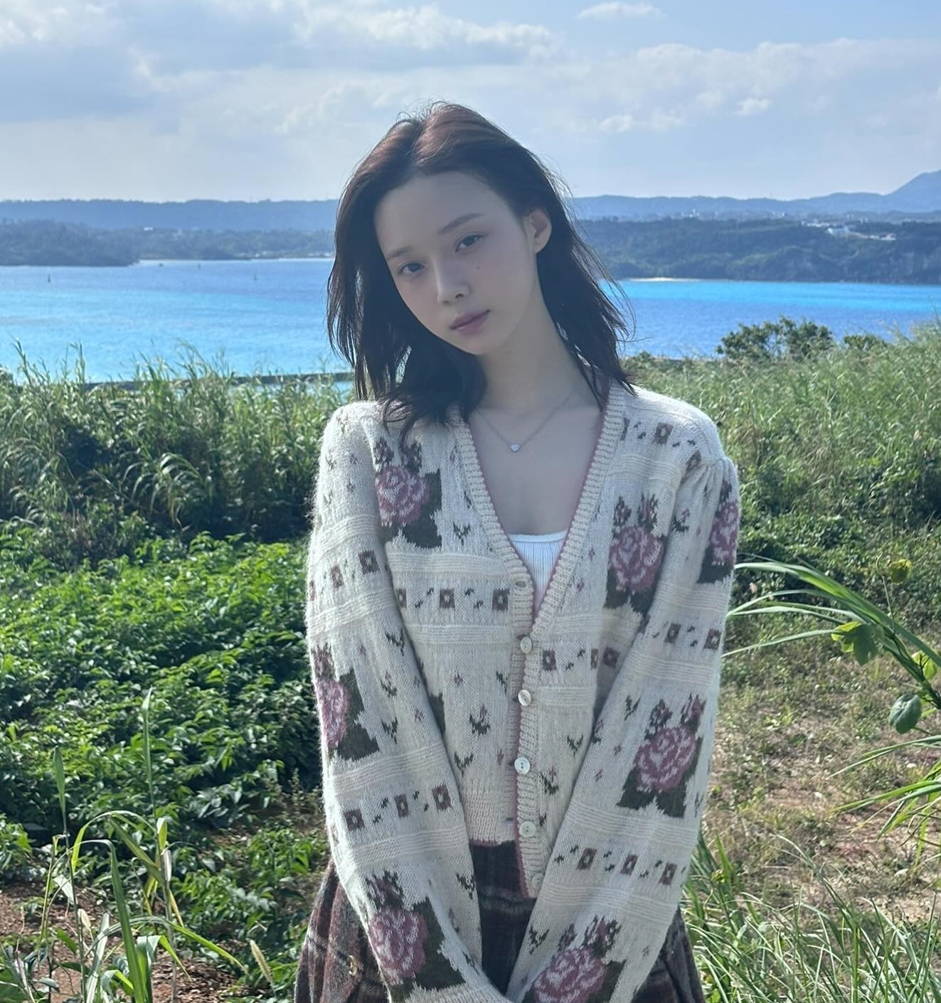 Set đồ gồm áo cardigan họa tiết hoa, chân váy kẻ và áo trắng layer bên trong gây ấn tượng ở nét nữ tính, dịu dàng. Dẫu vậy, bộ trang phục vẫn giúp người mặc "hack" tuổi. Một chiếc dây chuyền dáng mảnh sẽ tăng sự cuốn hút cho bộ đồ, đồng thời đảm bảo nét tinh tế.