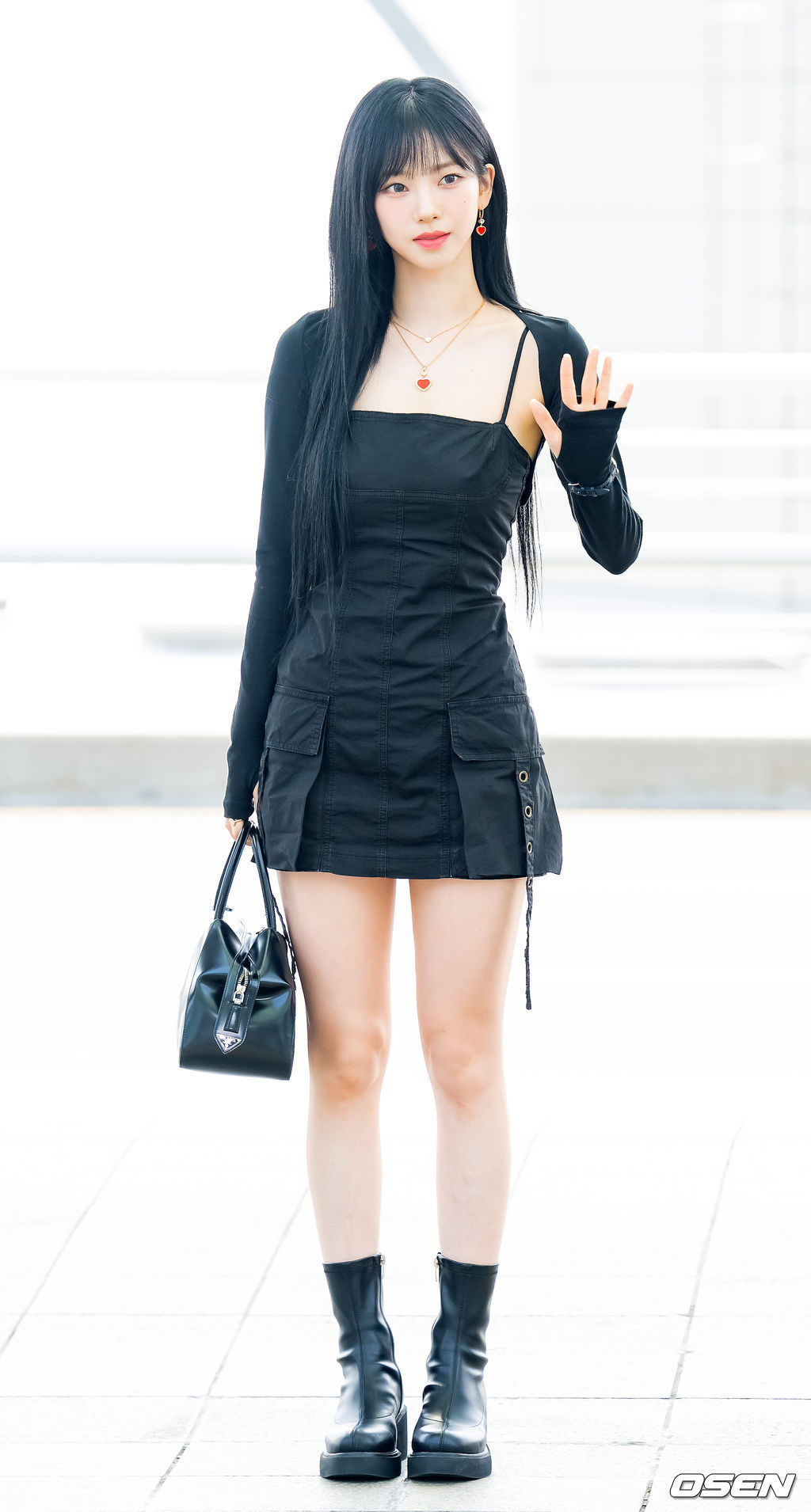 Set váy liền dáng ngắn và áo khoác lửng ghi điểm ở nét yêu kiều xen lẫn sự cá tính, bụi bặm. Boots thấp cổ và túi xách đen là những mảnh ghép hoàn hảo của bộ trang phục.