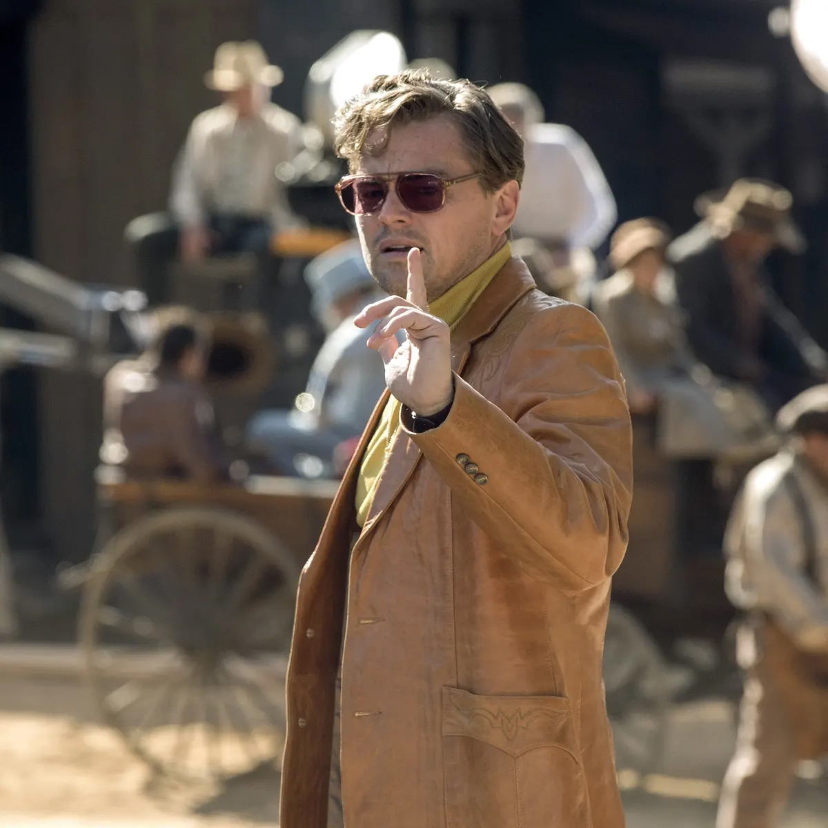Leonardo DiCaprio trong lần trở lại này hóa thân thành Rick Dalton, một diễn viên chuyên đóng phim miền viễn Tây đã hết thời và đang tìm cách lấy lại ánh hào quang của mình. Bộ phim lấy bối cảnh tại Hollywood vào những năm 70, và Dalton xuất hiện với áo khoác da nâu, áo cổ lọ, quần tây cạp cao và bốt cao bồi.