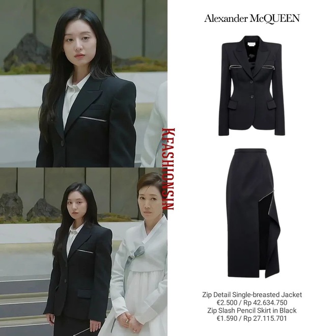 Tương tự với Lee Bo Jin, Kim Ji Won khi thủ vai ái nữ tập đoàn Queens cũng mặc đồ đơn sắc là chủ yếu, cách mix&match cũng rất sang trọng, toát lên thần thái của đại tiểu thu. Không chỉ vậy, trong phim cô cũng để mái tóc đen dài, lộ trán và uốn xoăn nhẹ nhàng.