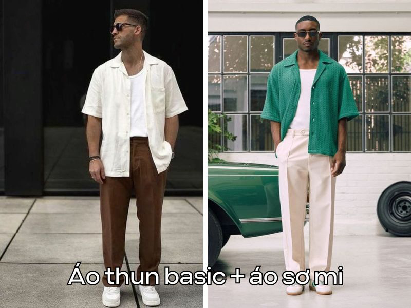 Phối layer với áo thun basic + áo sơ mi khoác ngoài + quần dài nam