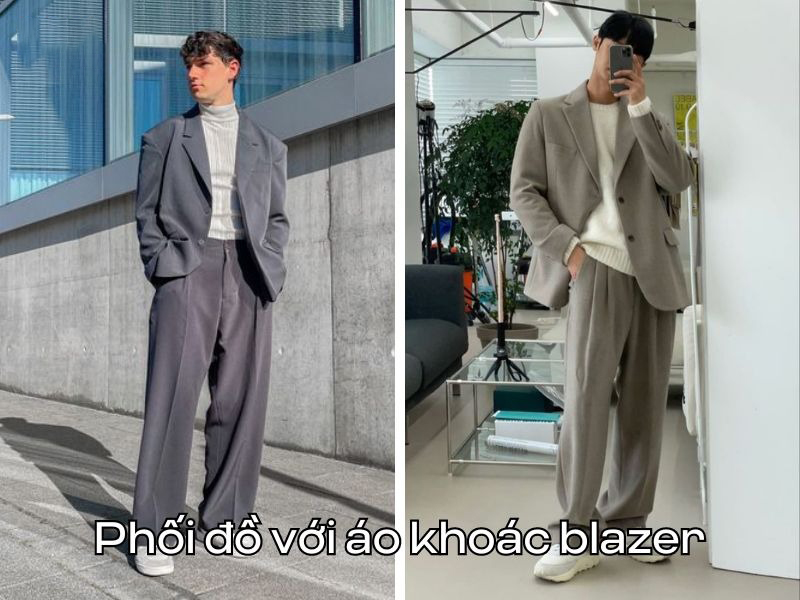 Bạn cũng có thể biến tấu cách phối đồ của mình khi chọn những chiếc áo sweater, áo thun cổ lọ và phối cùng với áo blazer. Bạn nên kết hợp cùng với những kiểu vải ống rộng nếu sở hữu thân hình cò hương.