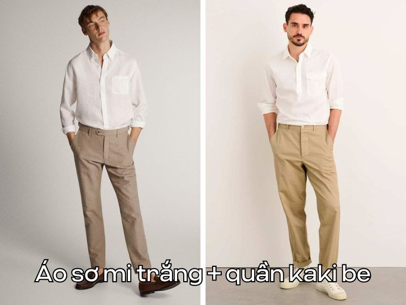 Áo sơ mi trắng + quần kaki màu be