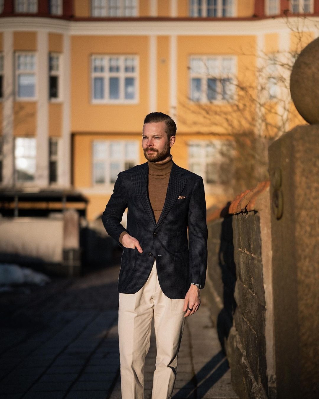 Khi thời tiết chuyển lạnh, một chiếc áo cổ lọ giúp giữ ấm cơ thể là item không thể thiếu. Nó trông đơn giản và cơ bản, nhưng lại mang đến cho người mặc cảm giác gọn gàng tinh tế. Bên cạnh đó, bạn hãy thử khoác thêm một chiếc áo single-breasted blazer với thiết kế sắc nét và kiểu dáng mạnh mẽ. Bộ đôi này sẽ giúp bạn trông lịch sự chỉn chu cho những sự kiện quan trọng.