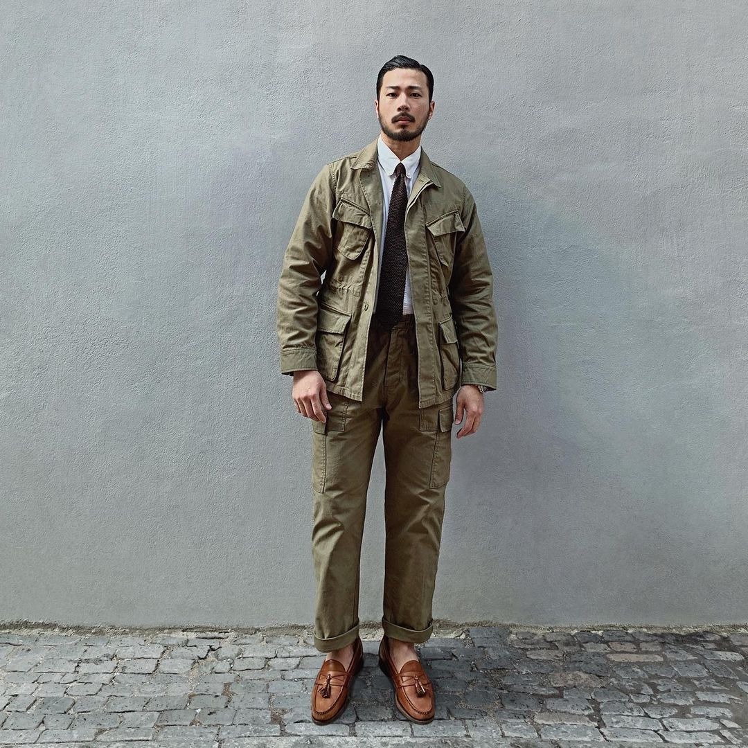 Lấy cảm hứng từ trang phục quân đội, chiếc áo khoác field jacket giờ đây không chỉ mang nhiệm vụ chắn gió, mà nó còn là item thời trang nam tính. Khi được kết hợp với áo sơ mi cài nút cổ button-down, nó tạo nên phong cách smart casual hoàn hảo. Về lựa chọn quần mặc, bạn có thể cân nhắc quần chinos, hay quần jeans đơn giản tối màu.