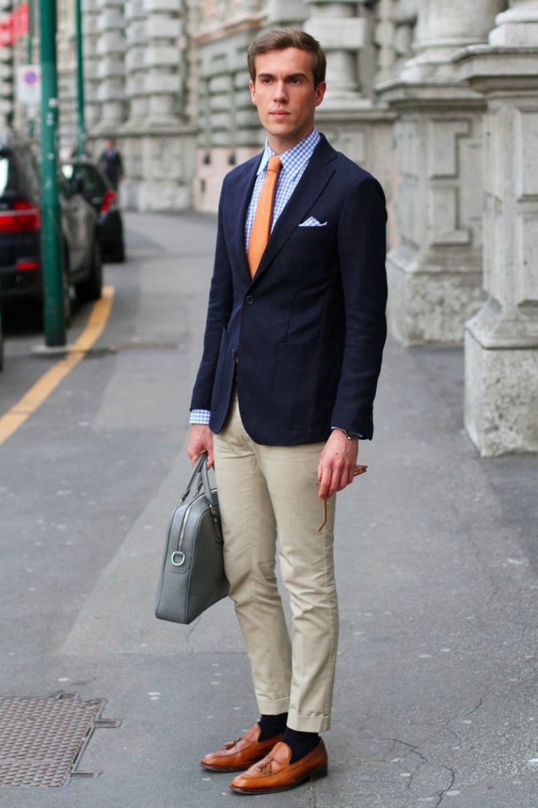 Để trở thành một quý ông lịch lãm trong mắt đồng nghiệp hãy chọn ngay một chiếc áo sơ mi Oxford cùng quần chinos màu be, trắng ngà, xanh navy hoặc xanh olive. Đừng quên tính smart ở đây được tạo dựng bằng những đôi giày tây và những chiếc blazer hoặc suit jacket nhé!