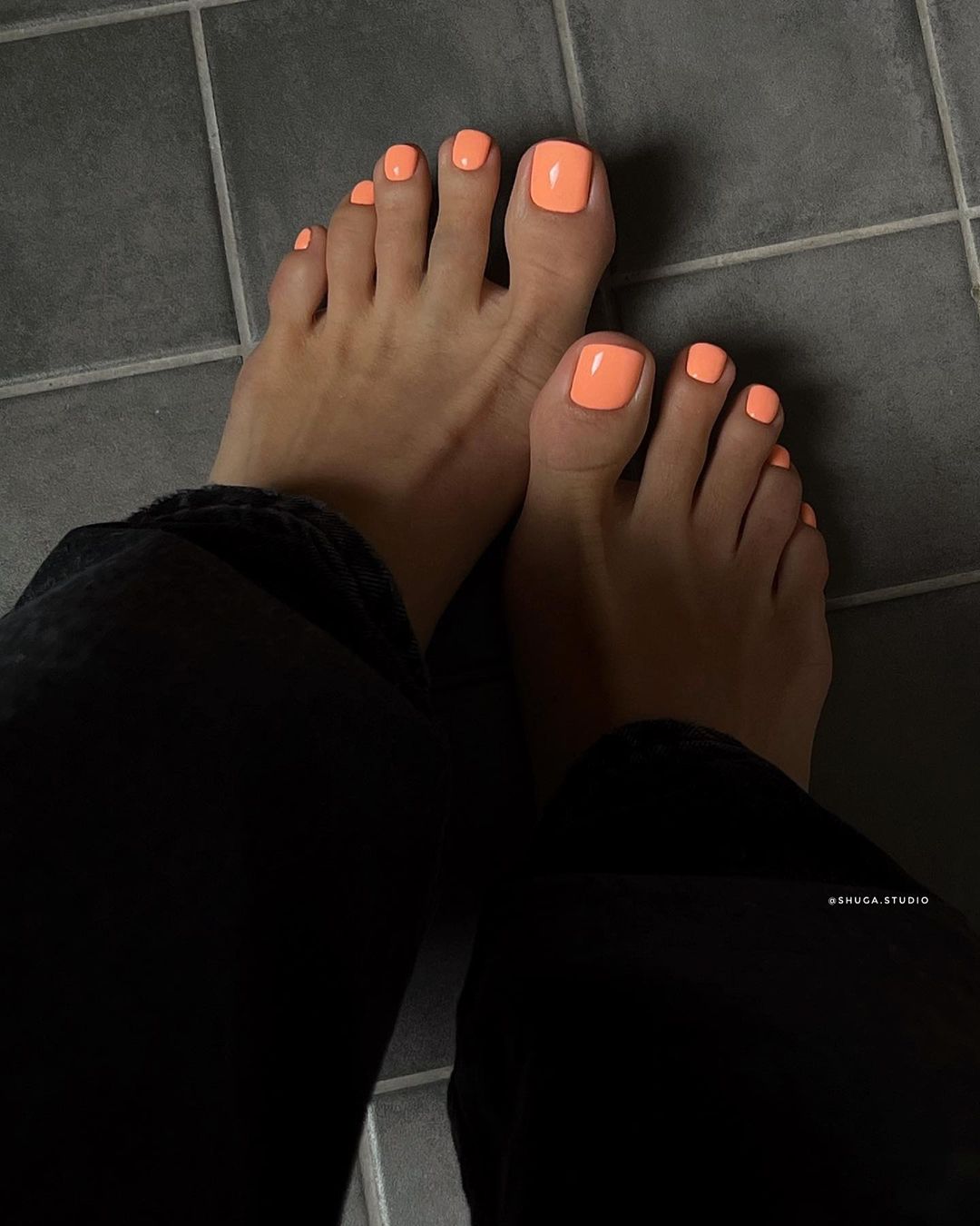 Nói đến xu hướng màu móng chân, bạn không thể bỏ qua tông cam đào. Đây cũng là mà sắc của năm 2024, với sắc thái ấm áp và ngọt lịm, gợi nhớ về miền quê mộng mơ cùng khu vườn sum suê hoa quả.
