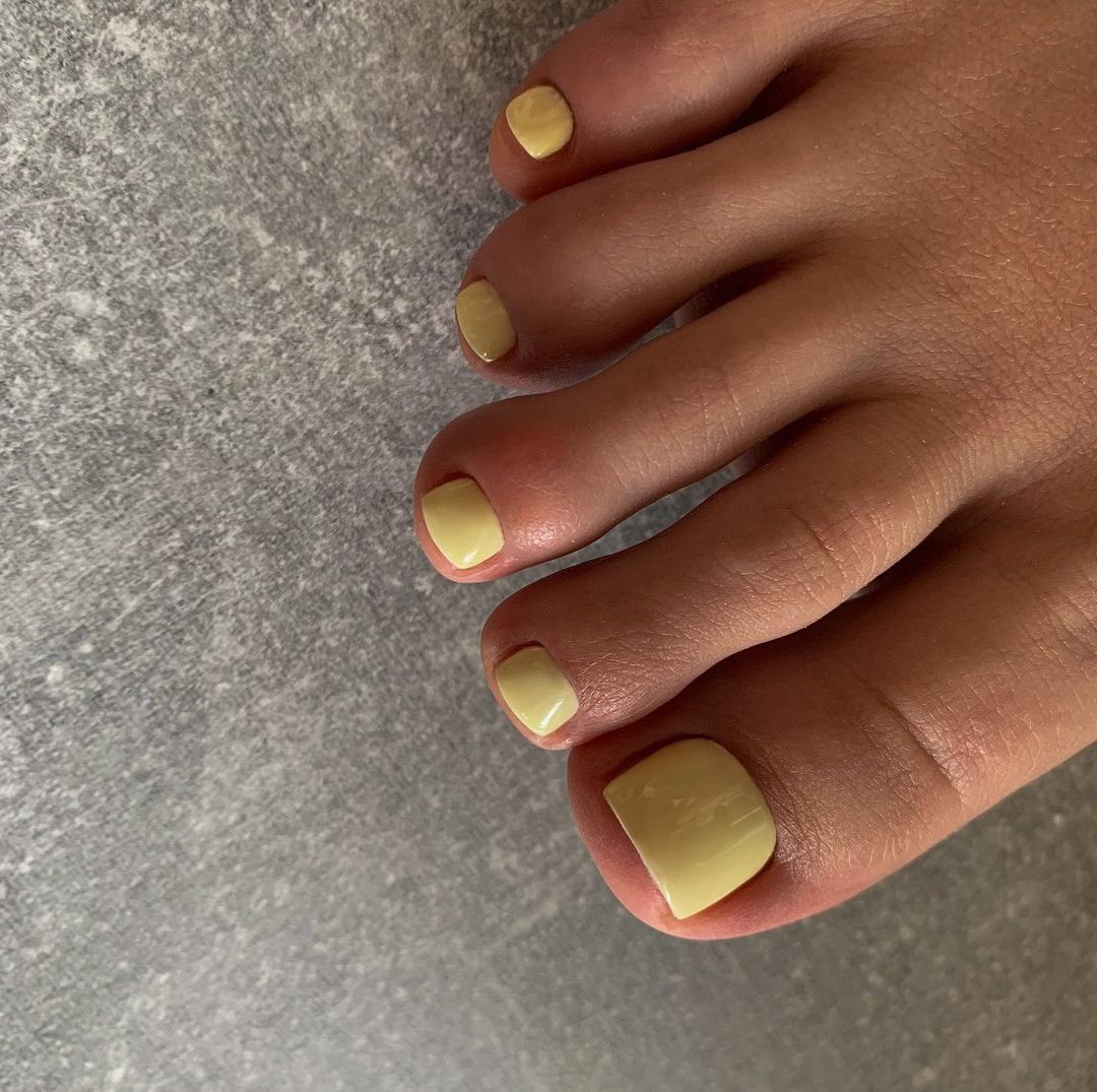 Nếu mùa Xuân là màu của mai vàng rực rỡ, mùa Hè sẽ là dịp sắc vàng bơ “lên ngôi”. Mang lại cái nhìn tươi sáng nhưng không quá sặc sỡ, móng chân màu vàng bơ sẽ là gợi ý tuyệt vời dành cho bạn. Những chuyển động của ngón chân được điểm tô bằng sắc vàng lập ló như ánh dương mùa Hè.